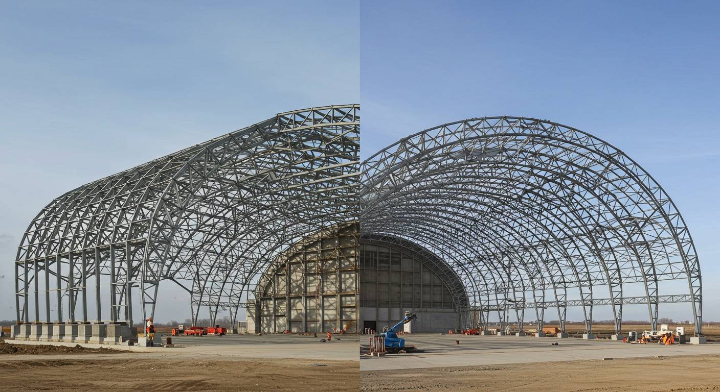 Основой ангаров для авиации является каркас из высокопрочной стали с антикоррозийной защитой. Для покрытия используют профилированный металл, сэндвич-панели с утеплителем или мембранные покрытия, которые обеспечивают теплоизоляцию и защиту от внешних воздействий. Важным аспектом является надежность соединений и устойчивость конструкций к динамическим нагрузкам от ветра и вибраций. Для арочных ангаров характерно использование сегментных дуг, соединяемых болтами или сваркой, что ускоряет монтаж и обеспечивает прочность конструкции на десятилетия.