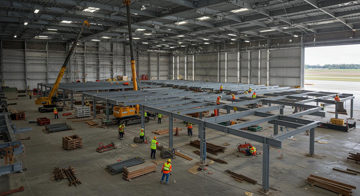 На фото: монтаж металлического ангара на этапе сборки каркаса