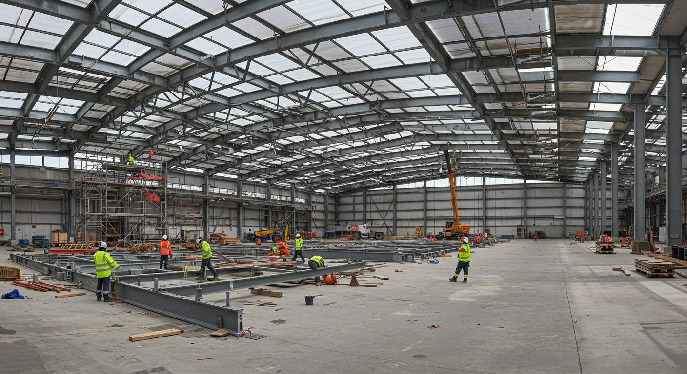 На фото: монтаж современного ангара с использованием быстровозводимых технологий